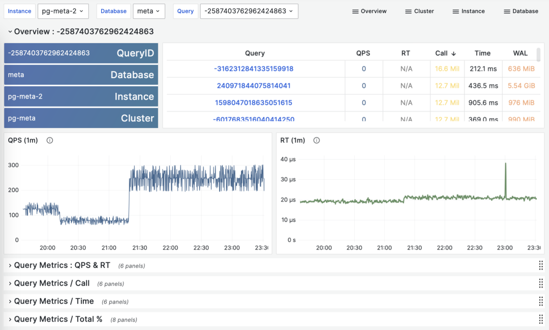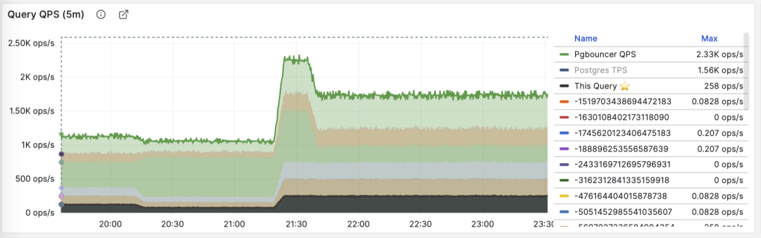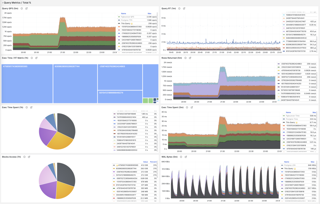 如果我们把所有查询组的 QPS 指标累加起来(且没超过PGSS的收集范围),就会得到所谓的 “全局QPS”。另一种获得全局 QPS 的方式是在客户端打点,在类似 Pgbouncer 的连接池中间件上采集,或者使用 ebpf 探测。但都不如 PGSS 方便。