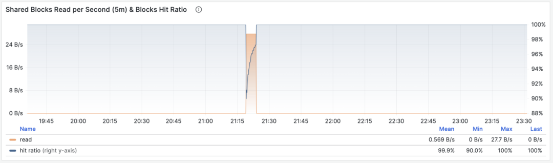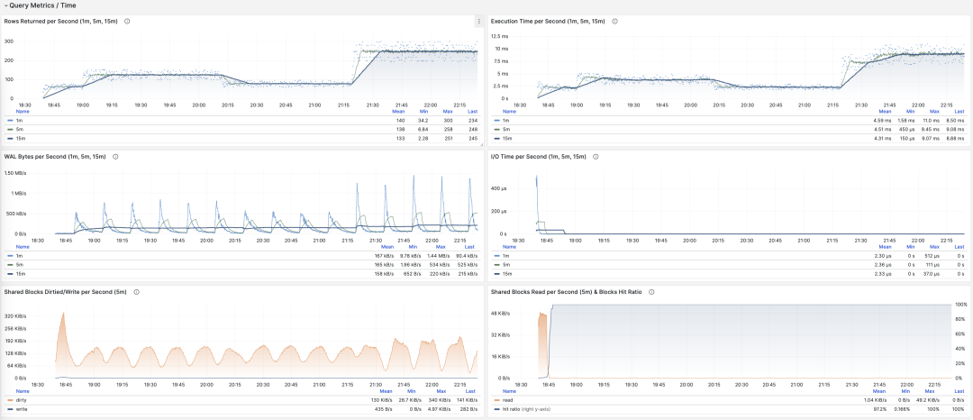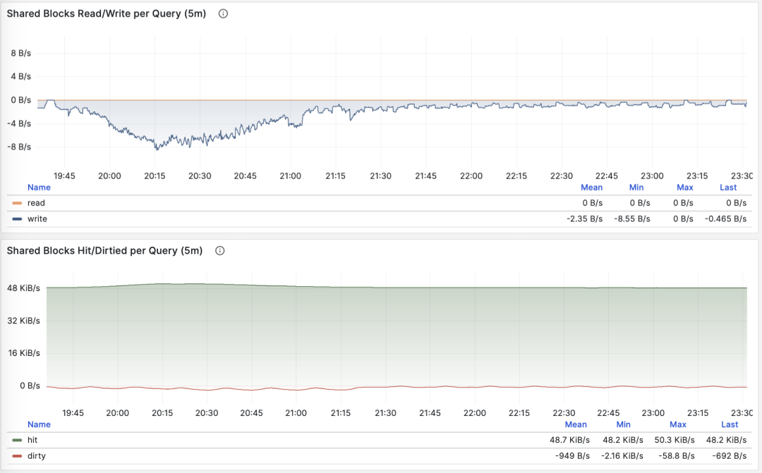 因为 PostgreSQL 会使用操作系统提供的 FS Cache,所以即使这里执行了块读取/写入,可能在文件系统层面上仍然是发生在内存中的缓冲操作。所以它只能作为一个参考指标,使用时需要谨慎,需要与主机节点上的磁盘 I/O 监控相互对照。