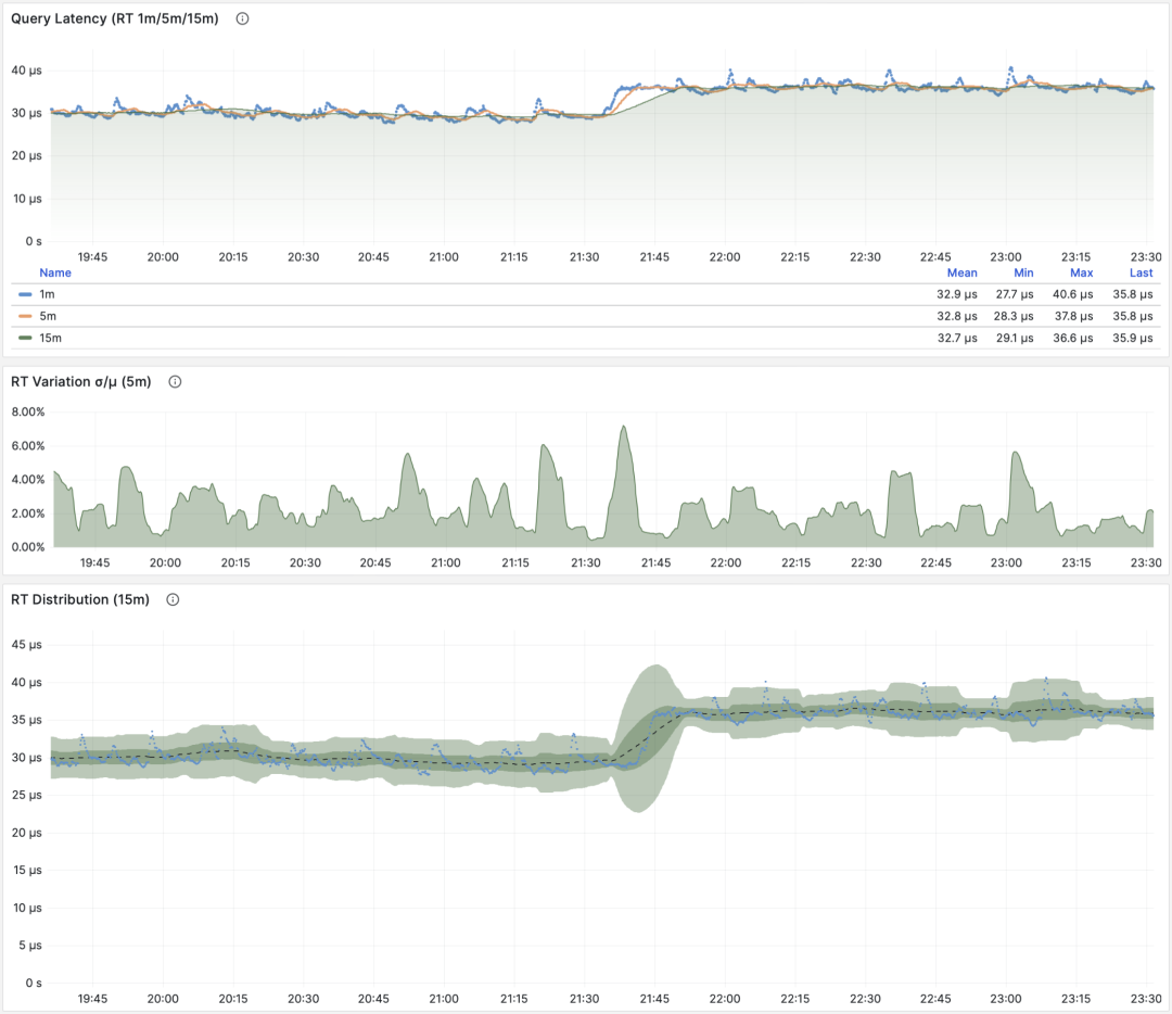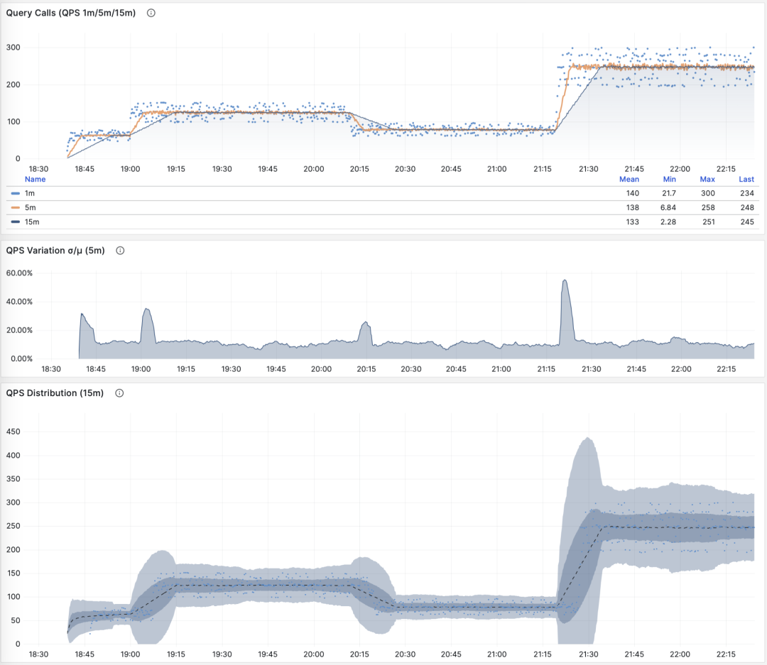 RT 是如此重要,以至于 RT 本身又会衍生出许多下游指标来:1分钟/5分钟/15分钟的均值µ与标准差σ自然必不可少;过去15分钟的 ±σ,±3σ 可以用来衡量 RT 的波动范围,过去1小时的 95,99 分位点也很有参考价值。