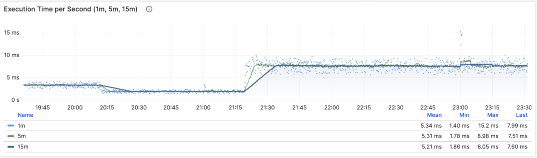 另一种值得关注的模式是此指标的突变,这通常意味着该查询组的执行计划可能出现了翻转/劣化,非常值得关注与进一步研究。