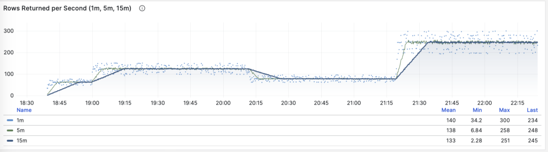 当 M 是 rows 时,我们会得到每秒该查询组返回的行数,单位是行/每秒(rows/s)。例如 10000 rows/s 意味着该类查询每秒向客户端吐出1万行数据。返回的行需要耗费客户端的处理资源,当我们需要检视应用客户端的数据处理压力时,这是一个非常有参考意义的指标。