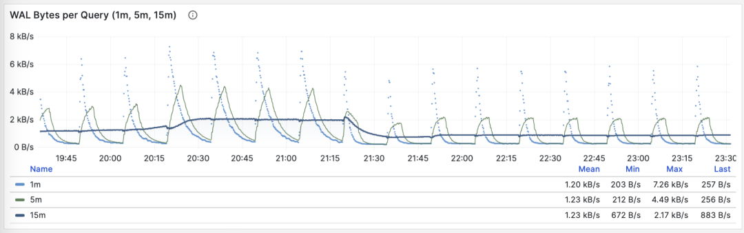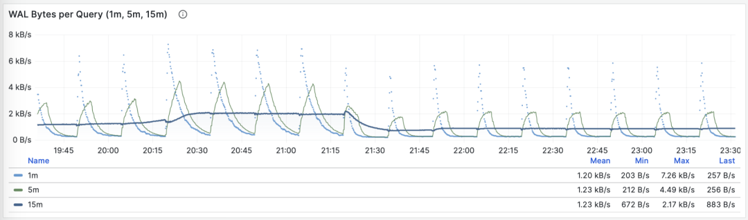 另一个用途是优化检查点/Checkpoint:如果你观察到此指标周期性的起伏(周期约等于 checkpoint_timeout),那么可以通过调整检查点间距,来优化查询产生 WAL 的数量。