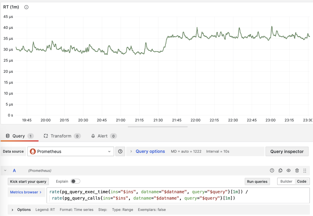 rate(pg_query_exec_time{}[1m]) rate(pg_query_calls{}[1m])