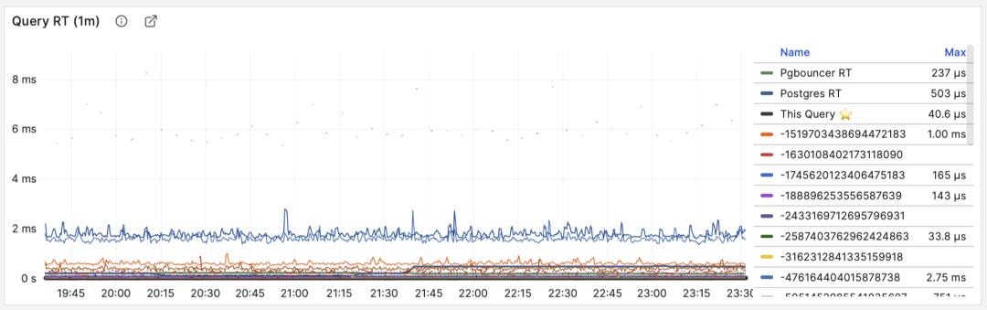你可以在客户端侧打点,采集语句执行时间,通过指标或者日志上报;你也可以尝试使用 ebpf 来探测语句 RT,这对基础设施和工程师要求会比较高。Pgbouncer 和 PostgreSQL (14+) 倒是也提供了 RT 指标,只可惜粒度都是数据库级别,没有一个能做到 PGSS 查询语句组级别的指标收集。