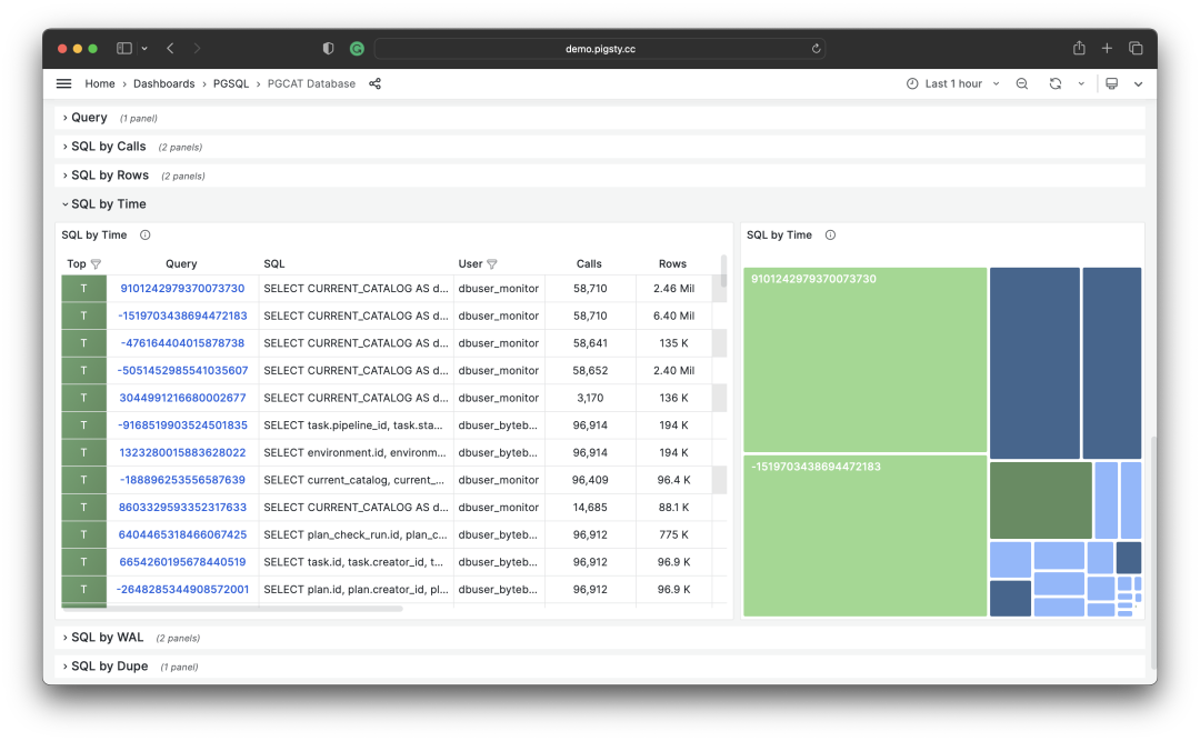 例如,我们可以使用饼图来标识过去1小时内耗时/IO使用最大的查询,使用二维树图(大小代表总耗时,颜色代表平均RT)来展示一个额外的维度。并用堆叠时序图来展示比例随时间的变化关系。