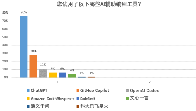 专业开发者为了提升开发效率,试用过各种主流的AI辅助编程工具。ChatGPT、GitHub Copilot是中国开发者重要试用对象,其次是Amazon CodeWhisperer 和OpenAI Codex。