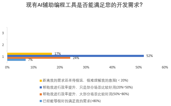 52%的开发者认为,AI工具虽然能用,可以实现效率提升,但只是部分场景比较好用。有17%的开发者认为,距离需求还差得很远,很难理解用户意图。仅有7%的人群认为,AI工具体验很好,能满足开发需求。