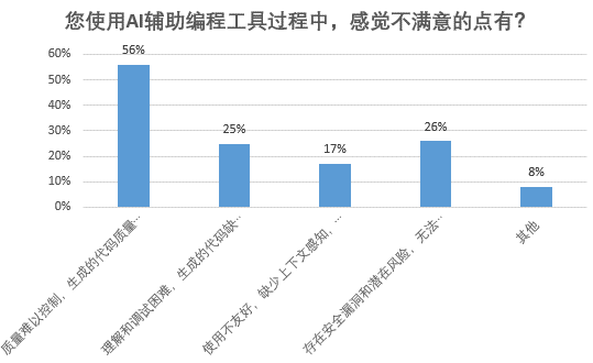 AI辅助变成工具体验不好的点是,存在质量问题。56%的开发者认为,现有工具质量难以控制,生成的代码质量不稳定或不足以满足实际需求;26%的开发者表示,现有应用存在安全漏洞和潜在风险,无法理解安全性需求;25%的开发者在使用AI工具中的最大挑战是:理解和调试困难,生成的代码缺乏清晰的注释和可读性;还有17%的开发者认为,现有AI工具使用不友好,缺少上下文感知,操作麻烦。