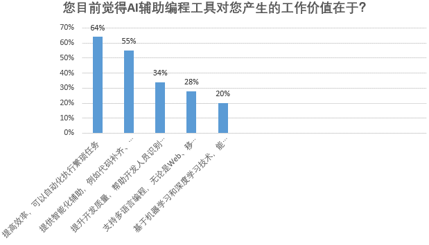 64%的开发者认为,AI工具可以提高效率,能自动化执行繁琐任务。55%的开发者认为,随着AI工具的不断成熟,将在智能化辅助方面提供助力,例如代码补齐、错误提示和建议等。AI工具带来的价值是,支持多语言编程,无论是Web、移动应用还是数据分析和机器学习,都能找到相应工具。有28%的开发者看好这一技术方向,未来通过自然语义进行代码编程,也不是没有可能。