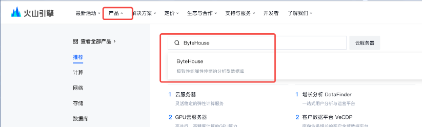 从 2017 年开始,字节内部的整体数据量不断上涨,为了支撑实时分析的业务,字节内部开始了对各种数据库的选型。经过多次实验,在实时分析版块,字节内部决定开始试水 ClickHouse。2018 年到 2019 年,字节内部的 ClickHouse 业务从单一业务,逐步发展到了多个不同业务,适用到更多的场景,包括 BI 分析、A/B 测试、模型预估等。在上述这些业务场景的不断实践之下,研发团队基于原生 ClickHouse 做了大量的优化,同时又开发了非常多的特性。2020 年,ByteHouse正式在字节跳动内部立项,2021年通过火山引擎对外服务。截止 2022 年 3 月,ByteHouse 在字节内部总节点数达到 18000 个,而单一集群的最大规模是 2400 个节点。在火山引擎官网的产品页中,我们可以搜到 ByteHouse 产品(如下图):1. 企业版:PaaS 模式、全托管、租户专属资源。2. 数仓版:SaaS 模式,在这个模式中,使用者可以免运维。用户通过控制台建表、导数据以及使用查询功能。