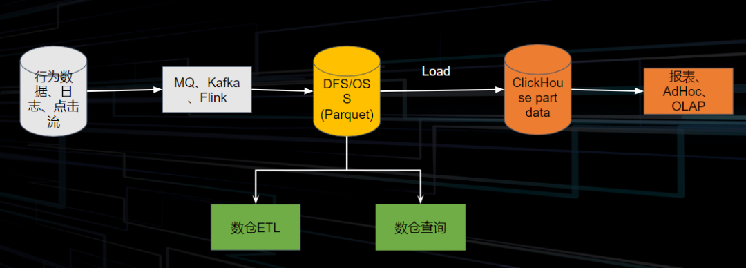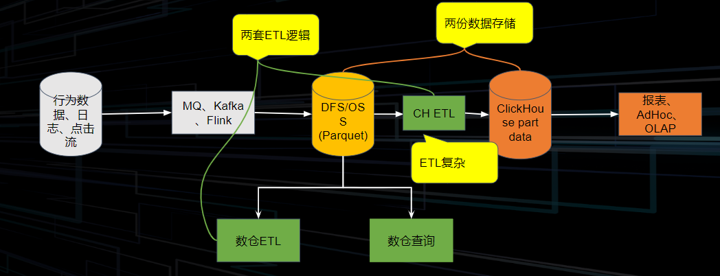 典型的数据链路如下:我们将行为数据、日志、点击流等通过 MQ/Kafka/Flink 将其接入存储系统当中,存储系统又可分为域内的HDFS和云上的 OSS&S3这种远程储存系统,然后进行一系列的数仓的 ETL 操作,提供给OLAP系统完成分析查询。但有些业务需要从上述的存储中做一个分支,因此会在数据分析的某一阶段,从整体链路中将数据导出,做一些不同于主链路的 ETL 操作,会出现两份数据存储。其次在这过程中也会出现两套不同的 ETL 逻辑。当数据量变大,计算冗余以及存储冗余所带来的成本压力也会愈发变大,同时,存储空间的膨胀也会让弹性扩容变得不便利。/ 复杂场景