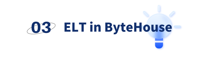 火山引擎ByteHouse 是一款基于开源 ClickHouse 推出的云原生数据仓库,本篇文章将介绍 ByteHouse 团队如何在 ClickHouse 的基础上,构建并优化 ELT 能力,具体包括四部分:● ELT in ByteHouse 实现方案及未来规划。谈到数据仓库, 一定离不开使用 Extract-Transform-Load (ETL)或 Extract-Load-Transform (ELT)。将来源不同、格式各异的数据提取到数据仓库中,并进行处理加工。传统的数据转换过程一般采用 Extract-Transform-Load (ETL)来将业务数据转换为适合数仓的数据模型,然而,这依赖于独立于数仓外的 ETL 系统,因而维护成本较高。现在,以火山引擎 ByteHouse 为例的云原生数据仓库,凭借其强大的计算能力、可扩展性,开始全面支持Extract-Load-Transform(ELT)的能力,从而使用户免于维护多套异构系统。具体而言,用户可以将数据导入后,通过自定义的SQL语句,在ByteHouse 内部进行数据转换,而无需依赖独立的 ETL 系统及资源。/ 关于 ByteHouse
