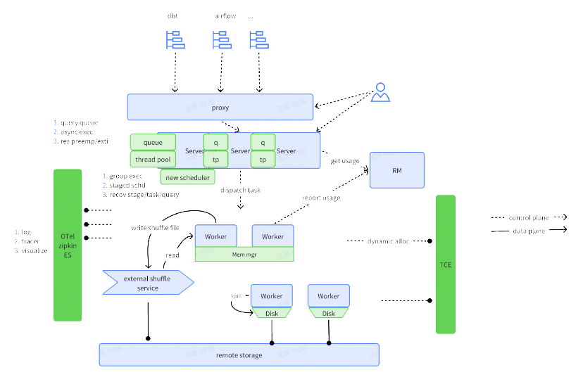 ● 自适应调度。每个sql 根据 worker 健康度动态的进行worker选择以及计算节点并发度控制