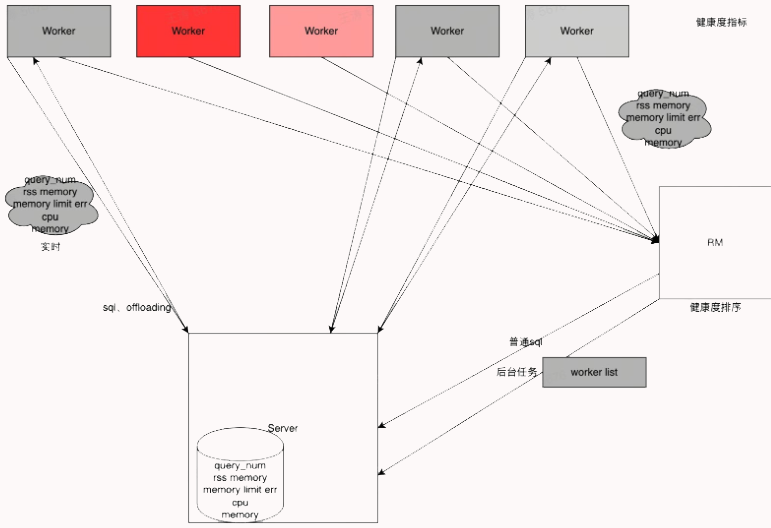 这就导致 worker 节点之间的负载严重不均衡。负载较重的 worker 节点就会影响 query 整体的进程。● 建立 worker 健康度机制。Server 端建立 worker 健康度管理类,可以快速获取 worker group 的健康度信息。包括 cpu、内存、运行 query 数量等信息。