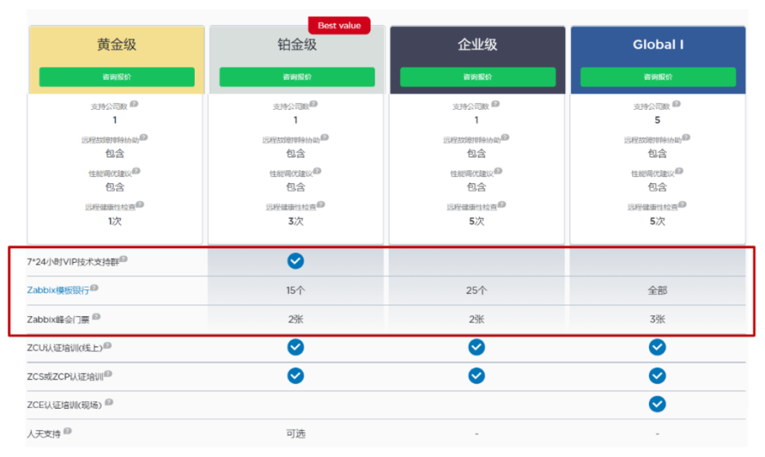 咨询服务: 为成熟的Zabbix用户提供具有前瞻性的架构优化,解决高难度问题。Zabbix专家提供现场咨询的专业支持服务,助你获得更好更快的IT投资回报。