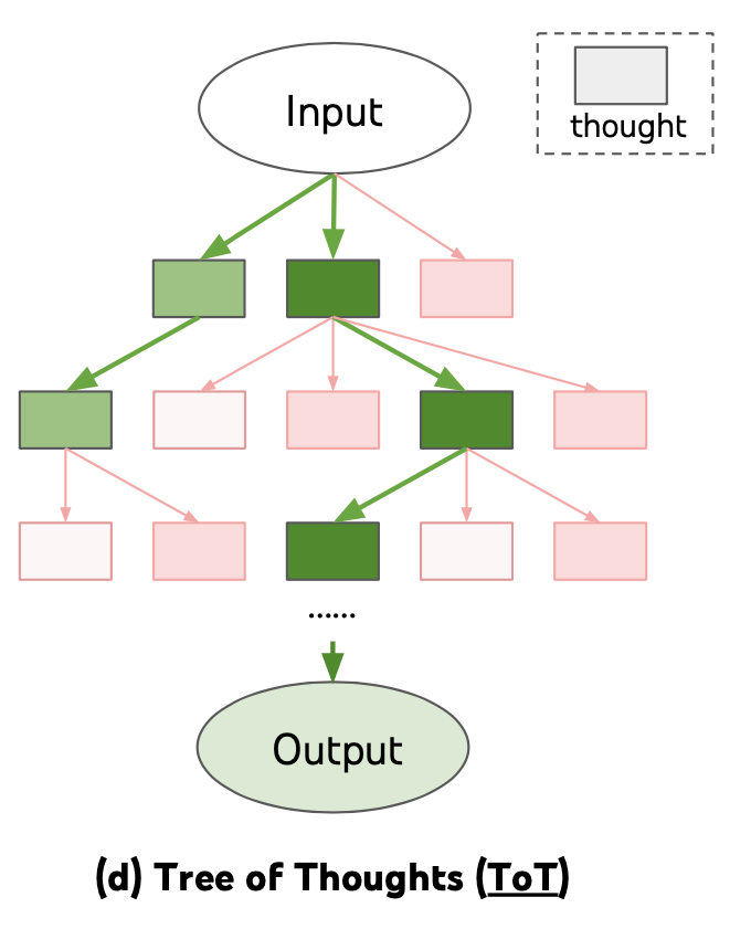 思维树(Tree of Thoughts)(Yao et al.2023)通过在每一步探索多种推理可能性来扩展了CoT。它首先将问题分解为多个思维步骤,并在每一步生成多种思考,创建一个树状结构。搜索过程可以是广度优先搜索(BFS)或深度优先搜索(DFS),每个状态都由分类器(通过提示)或多数投票进行评估。