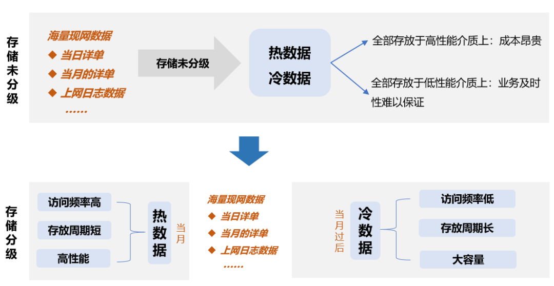 如果把所有数据等同看待,不对数据进行冷热区分,那么会导致把全部数据存放于高性能介质上则成本昂贵,如果全部存放于低性能介质上则业务及时性难以保证。在大数据平台中存储的数据可分为冷数据(特点是存放周期长但访问频率低)、热数据(特点是存放时间短但访问频率高)两类,例如当日、当月的详单、上网日志数据需要被详单查询系统、账务系统、客户行为分析等系统频繁访问,属于热数据。但到下月这些数据被访问频率会急剧降低,甚至不再被访问,属于冷数据。现网比较典型的为上网日志留存平台,根据两部委和集团要求,用户上网日志要保存12个月,12个月中只有最近1个月的数据为热数据。针对这种情况,河南移动IT资源维护室进行专项研讨,最终采用大数据存储分级方案,将冷热数据进行分级存储具有极大的能效价值,即热数据存放于SSD高性能介质以便保证业务性能,冷数据存放于SATA普通性能介质。热数据主要为高IOPS、低时延要求的业务,主要为随机读写频繁的业务。例如:需要提供实时检索能力的月表,需要频繁查询的汇总表,需要频繁查询的天表、月表。冷数据为大容量、低成本、高吞吐量的业务,主要为海量数据的顺序读写和长久保存业务。例如:涉及海量数据存储的原始数据表,写多读少的数据表。