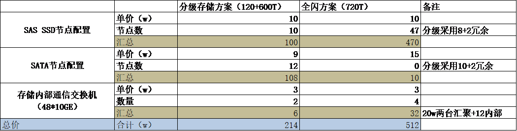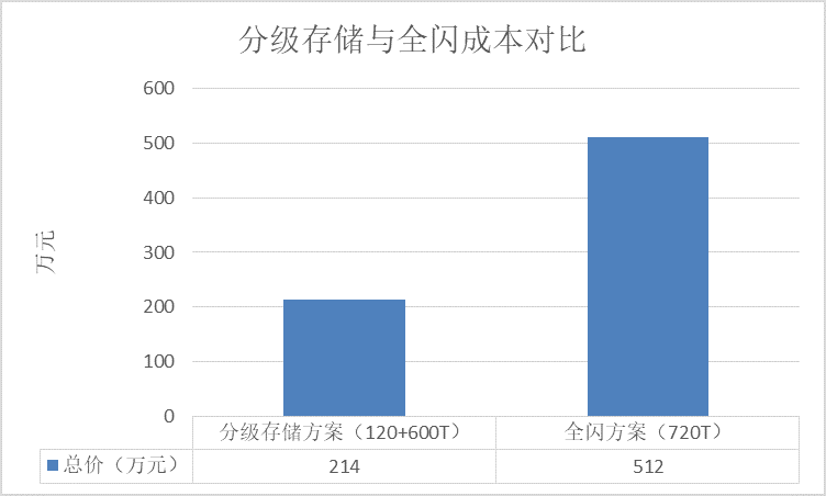 在我们的某一重要业务场景中,每月产生60T数据,根据要求需要保存一年内的数据,最近2个月为热数据,剩余10个月为冷数据。一年约产生720T数据,使用SSD节点+SATA节点分级存储方案和全SSD方案对比如图1所示,全闪方案需要47个节点,分级存储方案减少为22节点,对应需要的存储内部通信交换机也从4台降为2台,节省了50%的网络成本,总成本从512万降为214万,共节省了60%投资成本。