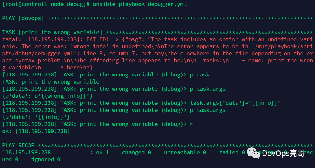 执行结果如下,可以看到,playbook执行到Task[print the wrong variable]时失败,进入到debugger模式下: