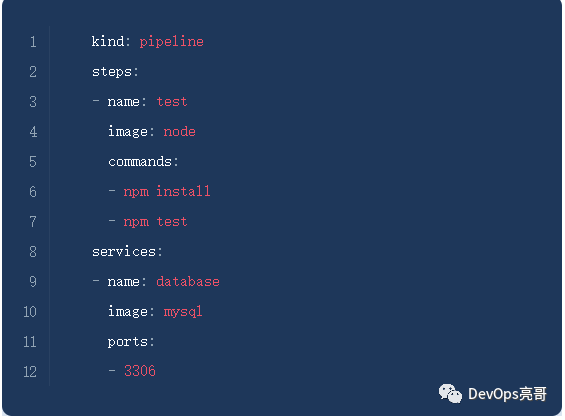 Drone中定义Pipeline(流水线)都是通过命名为.drone.yml的配置文件来定义的。这个配置文件是以简单、易读的YAML格式编写,如下图所示。这个.drone.yml文件需要和代码一起提交到Git版本控制仓库中,纳入版本管理,方便变更记录的跟踪和回溯。每条流水线的执行都是在一个独立的Docker容器中执行,在执行时自动下载需要的组件。