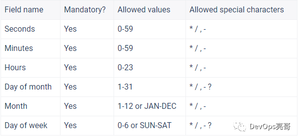 cron表达式代表了任务执行的时间集合,包含6个字段,各字段说明如下: