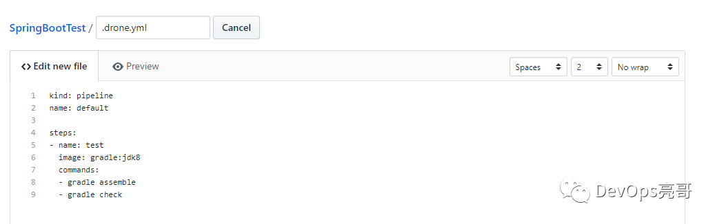 在Drone Cloud平台上,可以与Github集成,构建Github上的代码仓库,这里我选择了一个SpringBootTest的代码库,使用Github的页面编辑新增.drone.yml文件,如下: