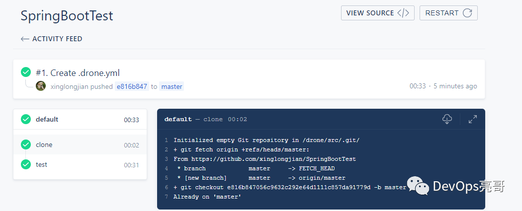 点击进入到流水线详情页面。第一步是clone代码库阶段,clone不需要在yml文件内声明。