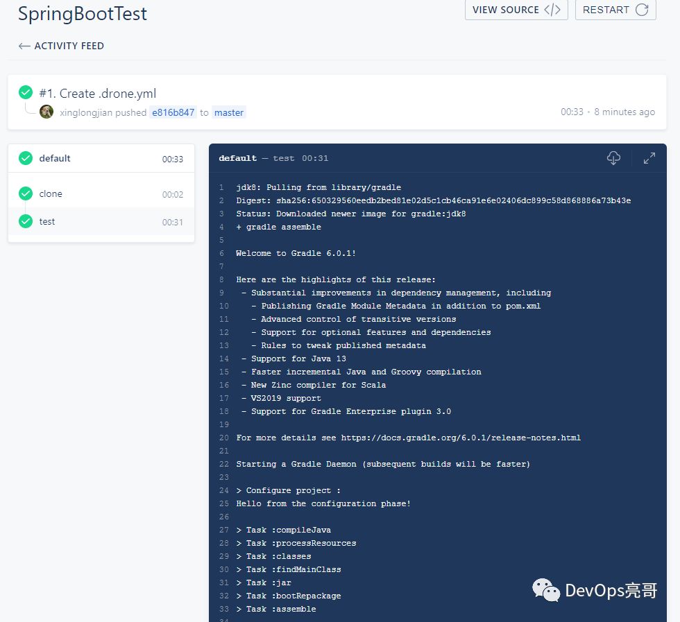 第二步是test阶段,这一步是.drone.yml文件中声明的,通过日志可以看出,该步骤是先拉取了gradle:jdk8的镜像,然后在该容器内部执行的流水线步骤。