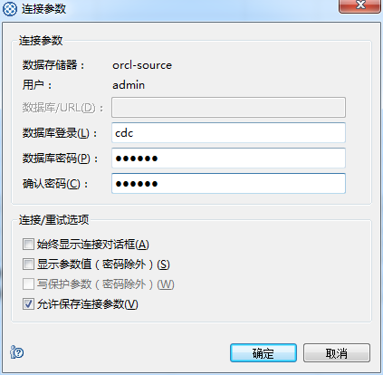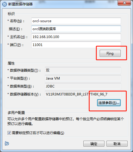 输入源端数据库数信息,点击PING后,再点击连接参数
