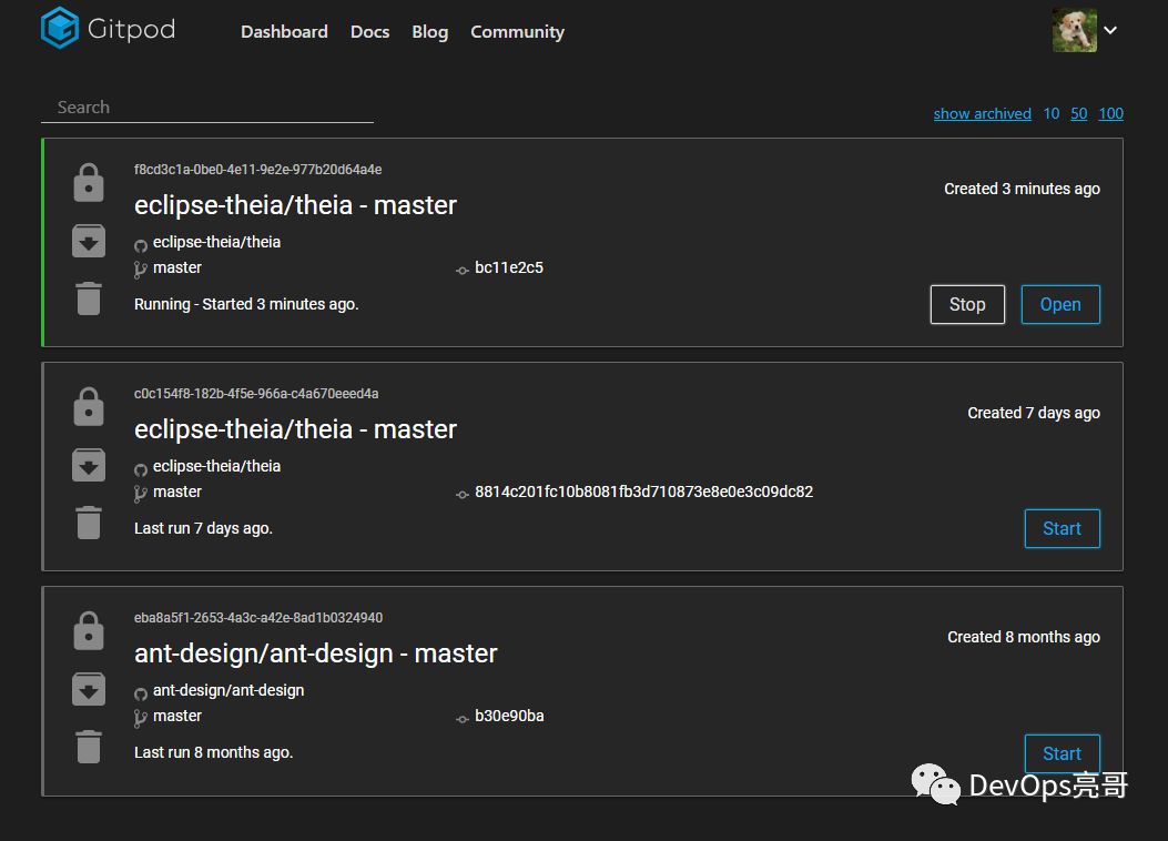 可以在Gitpod里试用Theia,如下界面是工作空间,这里可以搜索Gitpod里的代码库,会显示代码库的基本信息,比如:代码库名称和地址、版本控制信息、最近运行时间等。点击“open”即可打开代码空间。