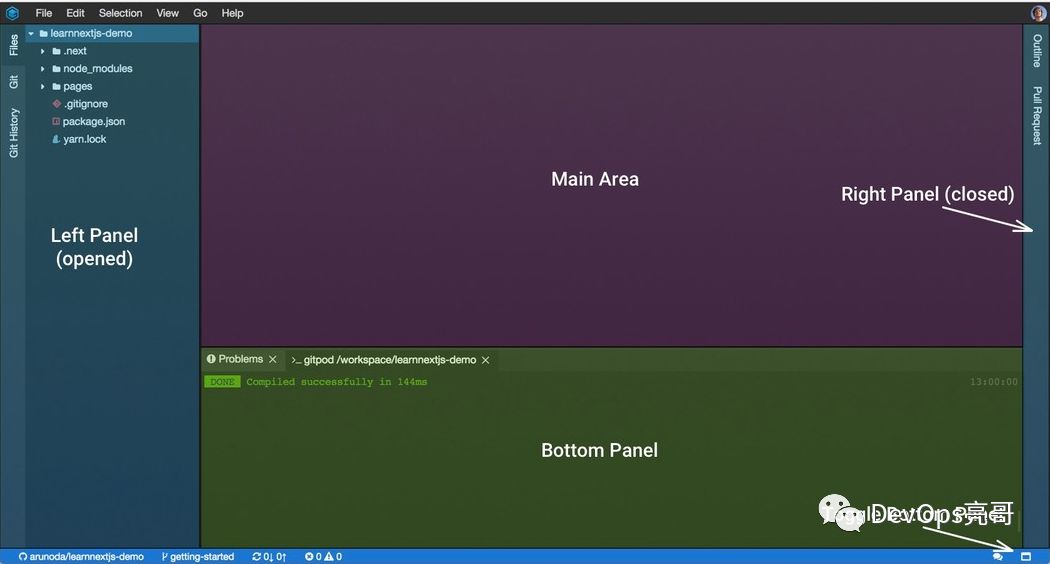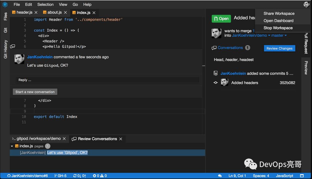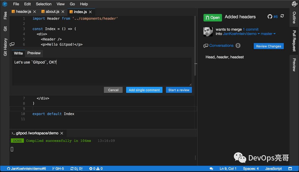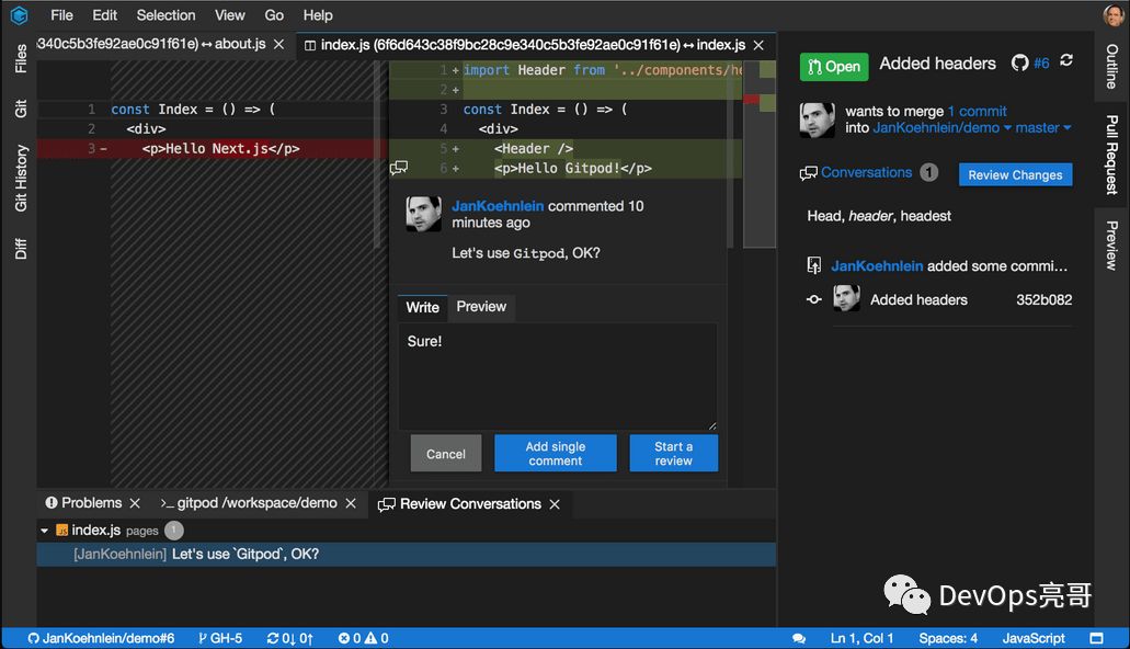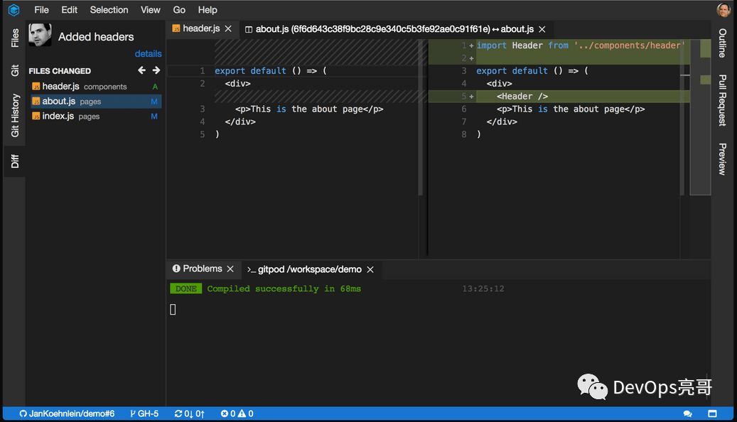 Gitpod基于Theia实现了Code Review的功能,当提交了PR后,会在Pull Request视图打开PR变更文件列表,双击文件名称会显示Diff视图,在Diff编辑器中浏览变更文件和审核代码。