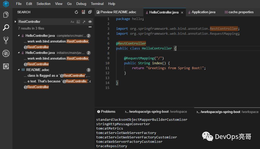 打开左侧面板中的搜索框,输入关键字后会立即显示检索结果并高亮显示。搜索可以限制大小写、完全匹配和正则表达式。搜索结果以文件分组并显示匹配关键字的数量。单击匹配行会在编辑器显示。点击...显示高级搜索。