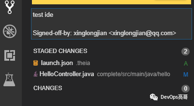 Git视图自动添加到左侧面板中,包括三个主要的区域,最上面是输入commit 信息,也提个了好多基本的Git命令。下面是提交文件部分,列出了变更的文件,包含两个部分:Staged Changed和 Changed,下面显示的是未暂存的文件。