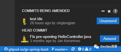 要启动一个Gitpod空间,在issue页面,点击“Gitpod”按钮,会打开一个开发空间。在底部状态栏会显示创建的一个本地分支GH-{issue-number}.,如果打开Git视图,在提交信息框中已经有"Fixes...."内容,这样当这个提交合并后就会自动关闭这个Issue。