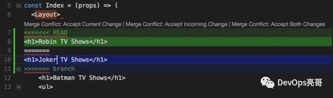 Theia会识别合并冲突,并高亮显示这些差异并提供内联操作来接受本地或引入的变更,一旦解决了冲突,就可以准备暂存和提交这些变更。