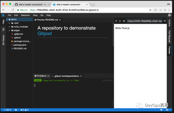 在Gitpod里用的是标准的Github开发流,每个任务都是以一个Github issue开始,在issue里描述这个任务、缺陷或特性,并且记录所有的讨论和相关的提交。