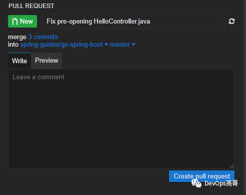 创建完后,在Pull Request视图会提供评审功能,可以给评审人留言,打开需要评审的文件,在代码行左侧需要添加评论的地方单击,即可添加评论。