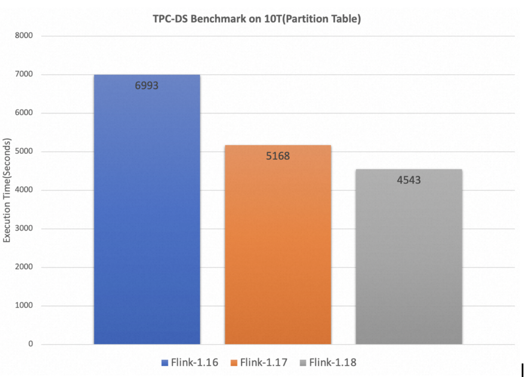自 Flink 1.16 以来,Apache Flink 社区一直在通过 TPC-DS 基准测试框架持续跟踪其批处理引擎的性能。在 Flink 1.17 版本中经过重大改进(动态 join 重排序、动态 local aggregation)后,前面描述的两项改进(算子融合、运行时过滤)在分区表 10T 数据集上,与 Flink 1.17 相比性能提高了 14%,与 Flink 1.16 相比性能提高了 54%。