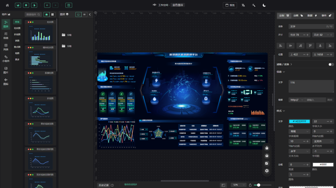 管理驾驶舱设计器能以在线拖拉拽的方式进行快捷开发,可以利用各类功能模块、图表工具等配置可视化界面。内置海量动画图形和行业图库,可以进行2D图形和3D模型自由组合,操作易上手,无需技术人员参与,只需要美工人员经过简单的培训就可掌握使用方法进行设计,支持全面的变量数据绑定,满足一体化监控管理需要,为管理人员决策提供及时、有效的数据支持。