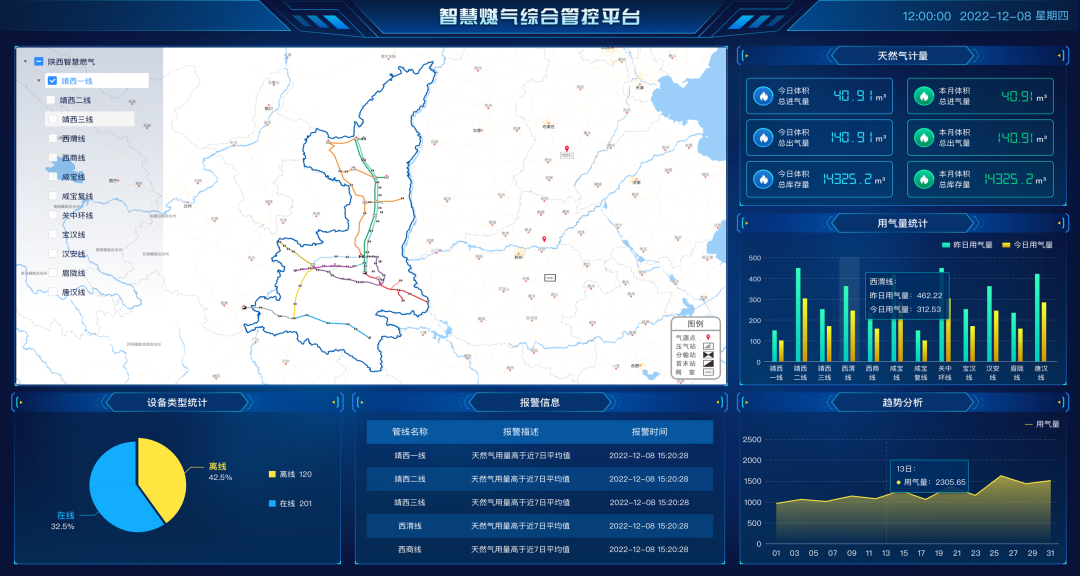 覆盖生产调度指挥、管网GIS 、三维可视化及管网管理等功能。系统功能紧密结合燃气企业运营业务流程,对管网、场站、燃气业务等进行一体化管理,有利于提高工作效率和质量,为用户提供优质服务。