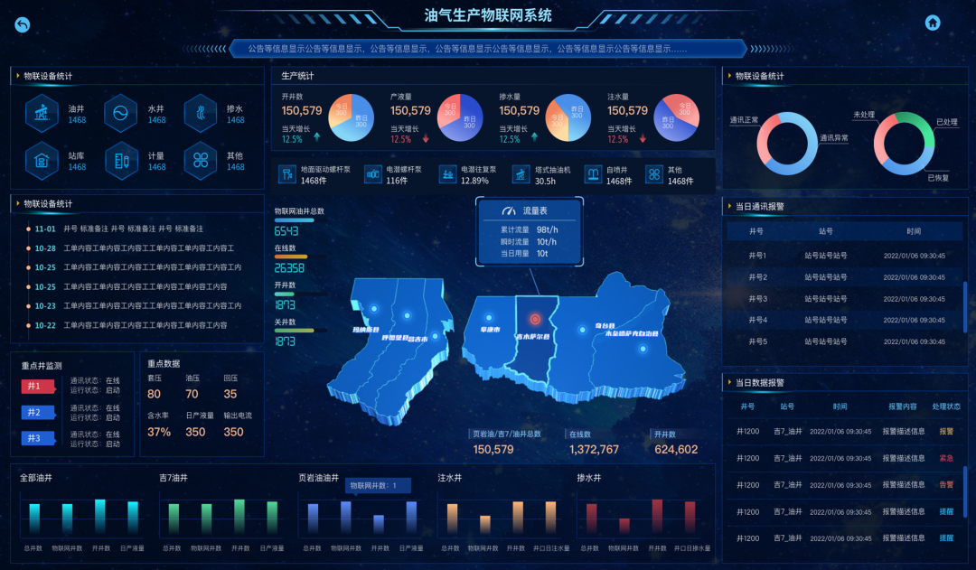 具备完整的生产数据采集、监控、管理、分析、共享的平台,涵盖综合可视化大屏、生产监控、数据汇总等八项常用功能,还包含了自动计量、生产日报、掺水分析及优化等三项智能应用。