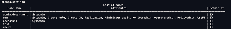 #例1:创建角色role1,同时授予role1创建数据库的权限openGauss=# CREATE ROLE role1 WITH CREATEDB password 'openGauss@2021';CREATE ROLE#例2:授予角色role1监控管理员的权限,同时取消创建数据库的权限openGauss=# ALTER ROLE role1 WITH MONADMIN NOCREATEDB;ALTER ROLE#例3:查看系统表pg_authid或系统视图pg_roles获取角色role1的相关信息openGauss=# SELECT rolname,rolcreatedb,rolmonitoradmin FROM pg_authid WHERE rolname= 'role1';rolname | rolcreatedb | rolmonitoradmin---------+-------------+-----------------role1 | f | t(1 row)