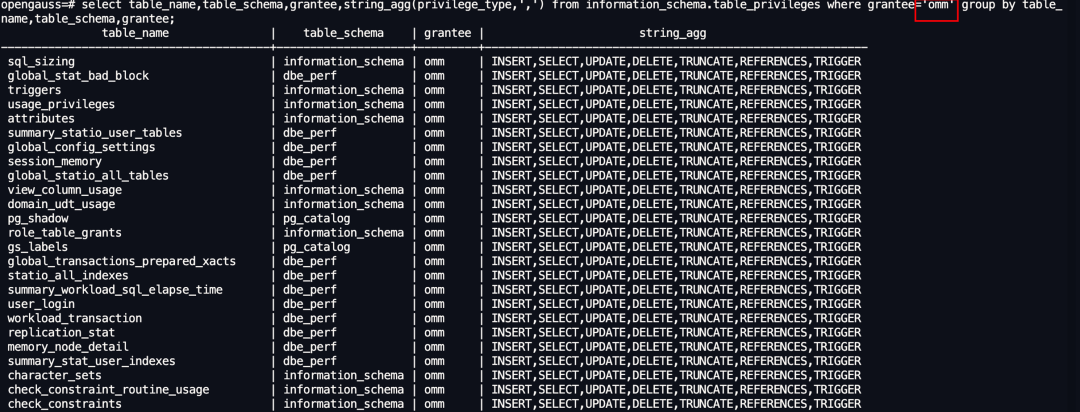 opengauss=# select table_name,table_schema,grantee,string_agg(privilege_type,',') from information_schema.table_privileges where grantee='opengauss' group by table_name,table_schema,grantee;