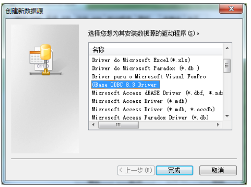 5) 选择 GBase ODBC 8.3 Driver 驱动程序,然后点击完成。GBase 8a ODBC