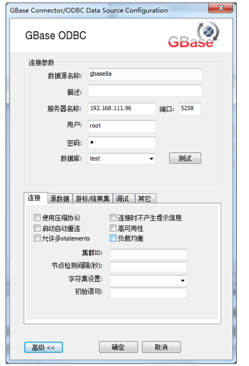 可以点击“高级”选项,来进行一些高级设置,DSN 配置对话框页有选项按