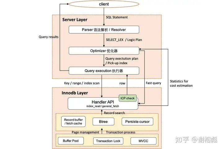 最后由执行器操纵存储引擎提供的 API 读取索引的数据,此时在 Innodb 层,Server 的 SQL 查询,就已经转化为对 btree 索引的点查询或者范围查询,Innodb 在读取过程中会考虑数据的管理(page management),以及事务的隔离和并发访问(transaction lock 和 MVCC),最后将读取的 record 返回给 server 层,进行过滤,返回给用户。