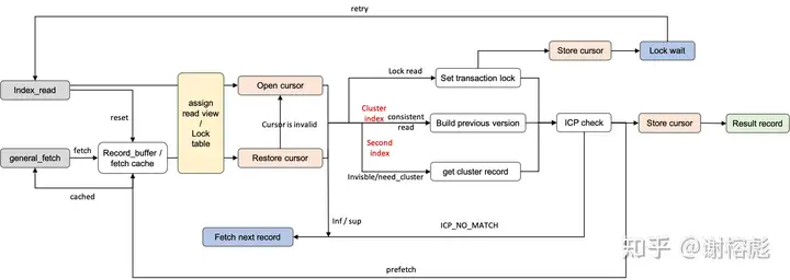 - general_fetch: 对于范围查询,基于 index_read 的 cursor 定位,读取前一行或者后一行数据,并移动 cursor。