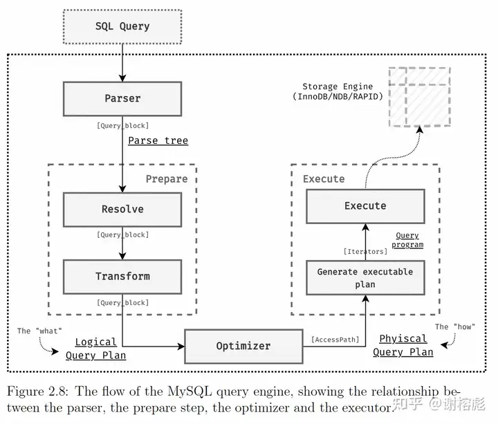为了了解 expression 在 MySQL 是怎么执行的,主要是看 query 在 MySQL 中的生命周期:parsing,preparing,optimizing 和 execution。下图是 MySQL 查询引擎的生命周期,每个组件的输入和输出,到最后怎么拿到真实的存储引擎的数据:数据流动过程是从 SQL statement 到 Query_block 到 AccessPath,到 Iterators,再到存储引擎。