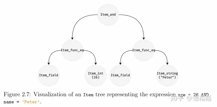 根据这些类的性质,可以以 Item 的树形式构造所有类型的表达式,其中根节点的 Item 表示完整的表达式, 叶节点是涉及到的算子。如下图用 Item 表示了表达式 “age = 26 AND name = ’Peter’”。