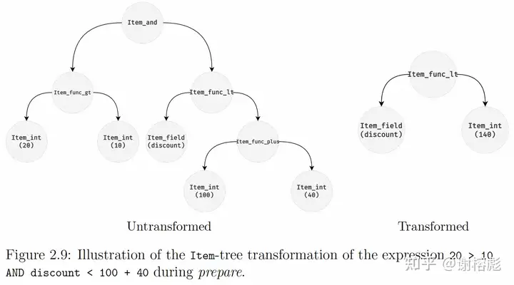 Prepare 的另一个重要工作是简化 Query_block 的内容。优化 Item 树来减少计算深度。如前面提到的常量折叠(直接给出常量计算值)和无效代码的去除。在解析和转换 Query_block 的不同部分之后,如下图就是将 “20>10” 和 “100+40” 两个直接运算简化的过程,该阶段的最终输出简化的 Query_block 称为逻辑查询计划。
